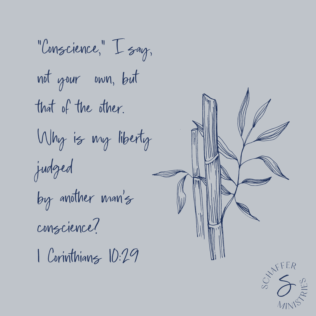 “Conscience,” I say, not your own, but that of the other. For why is my liberty judged by another man’s conscience? 1 Corinthians 10:29