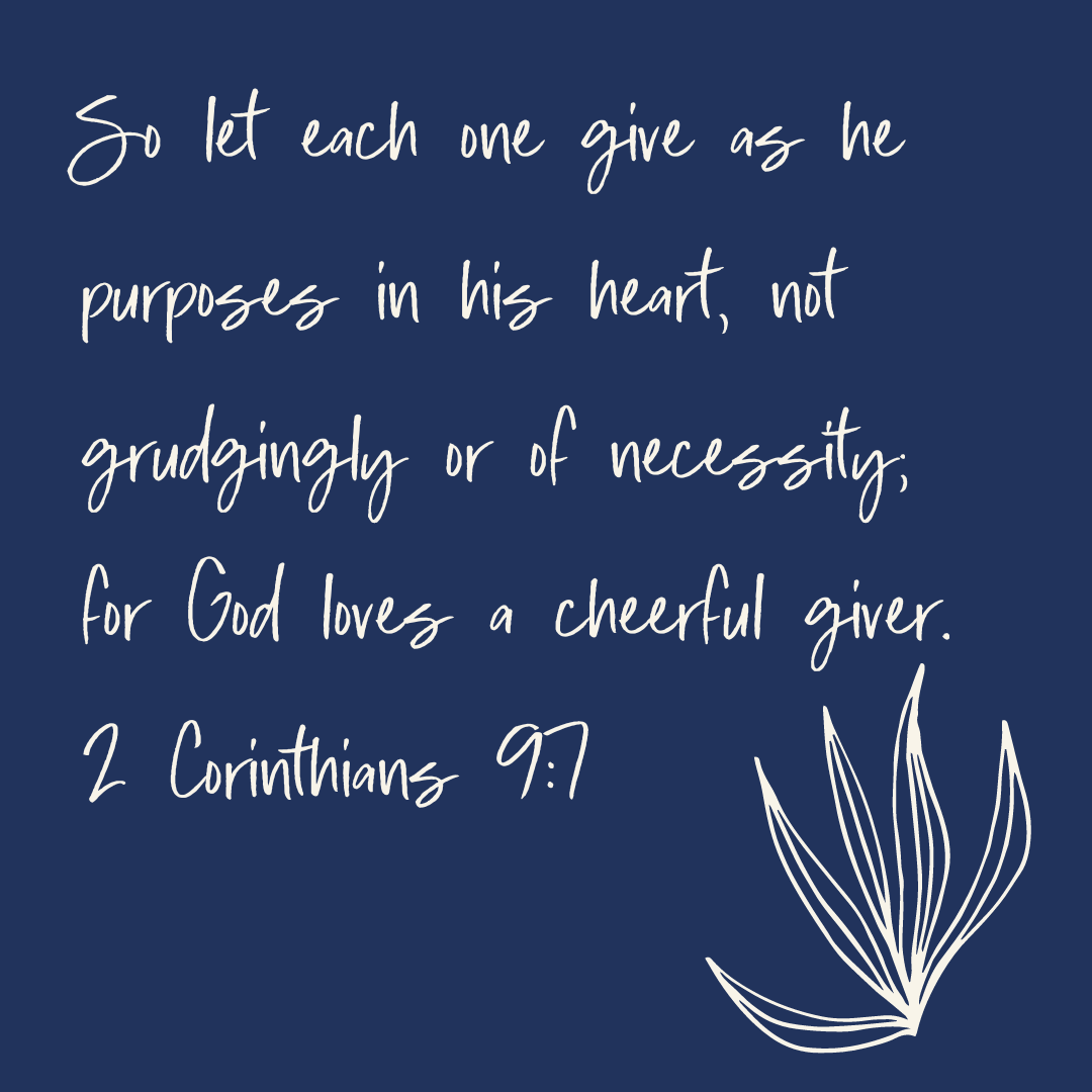 So let each one give as he purposes in his heart, not grudgingly or of necessity; for God loves a cheerful giver. 2 Corinthians 9:7
