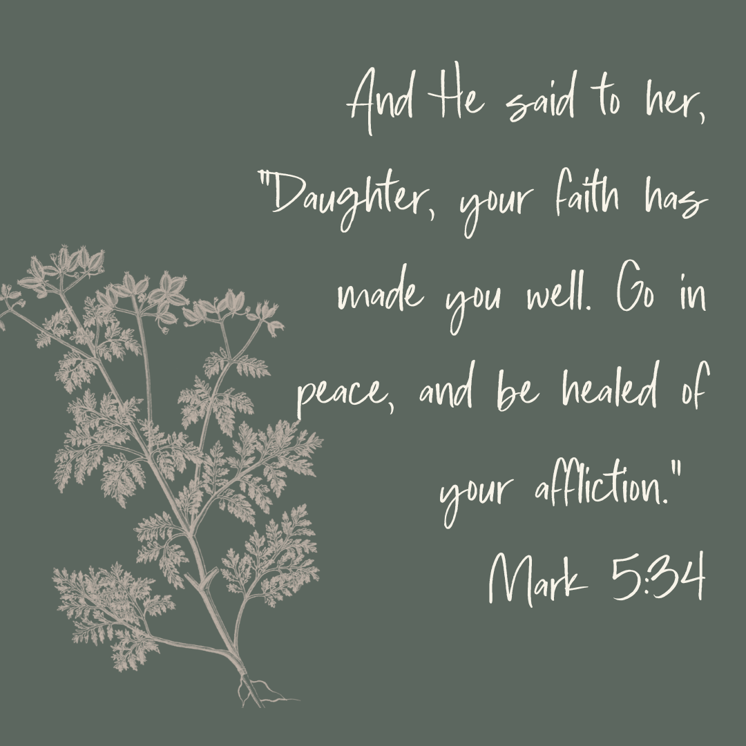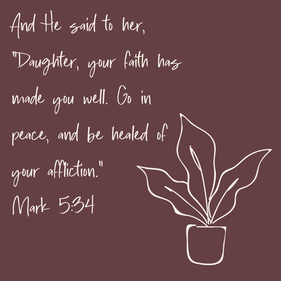 And He said to her, "Daughter, your faith has made you well. Go in peace and be healed of your affliction.” Mark 5:34